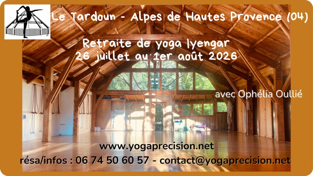 Marie-France will draw on ancient texts, particularly the “Yoga Sutras of Patanjali” (Frans Moors, ed.) and the Cahiers de Présence d’Esprit (Cahiers of Presence of Mind); “Patanjali and the Yoga Sutras” (Jean Bouchard d’Orval, ed.) and the Yogi Bible, also cited by B.K.S. Iyengar. “Light on Yoga” (B.K.S. Iyengar, ed.) and Harper Collins paperback.